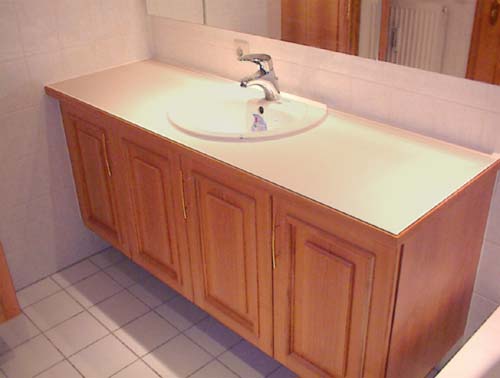 Der Waschtisch mit großzügigen Ablagemöglichkeiten hängt an der Wand ... reinigungs- und fußzehenfreundlich. |